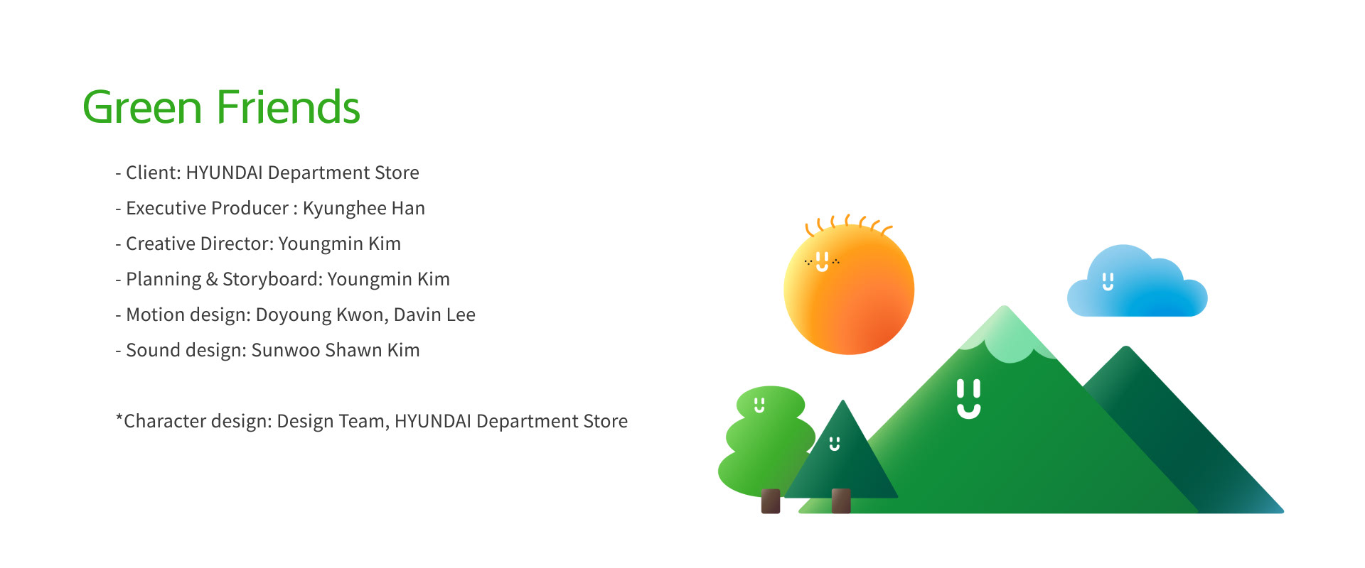 - Client: HYUNDAI Department Store - Executive Producer : Kyunghee Han - Creative Director: Youngmin Kim - Planning & Storyboard: Youngmin Kim - Motion design: Doyoung Kwon, Davin Lee - Sound design: Sunwoo Shawn Kim *Character design: Design Team, HYUNDAI Department Store