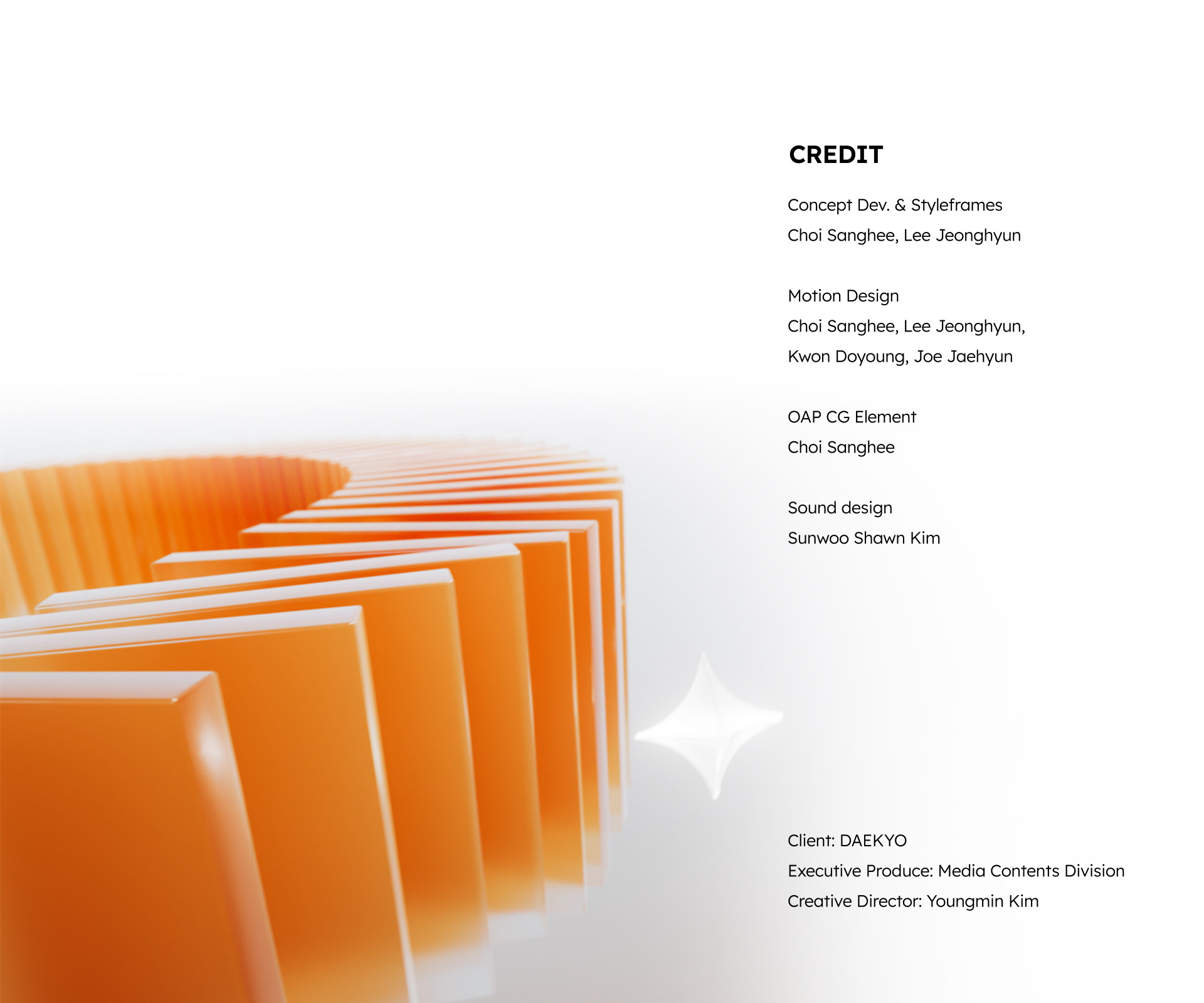 Concept Dev. & Styleframes Choi Sanghee, Lee Jeonghyun Motion Design Choi Sanghee, Lee Jeonghyun, Kwon Doyoung, Joe Jaehyun OAP CG Element Choi Sanghee Sound design Sunwoo Shawn Kim