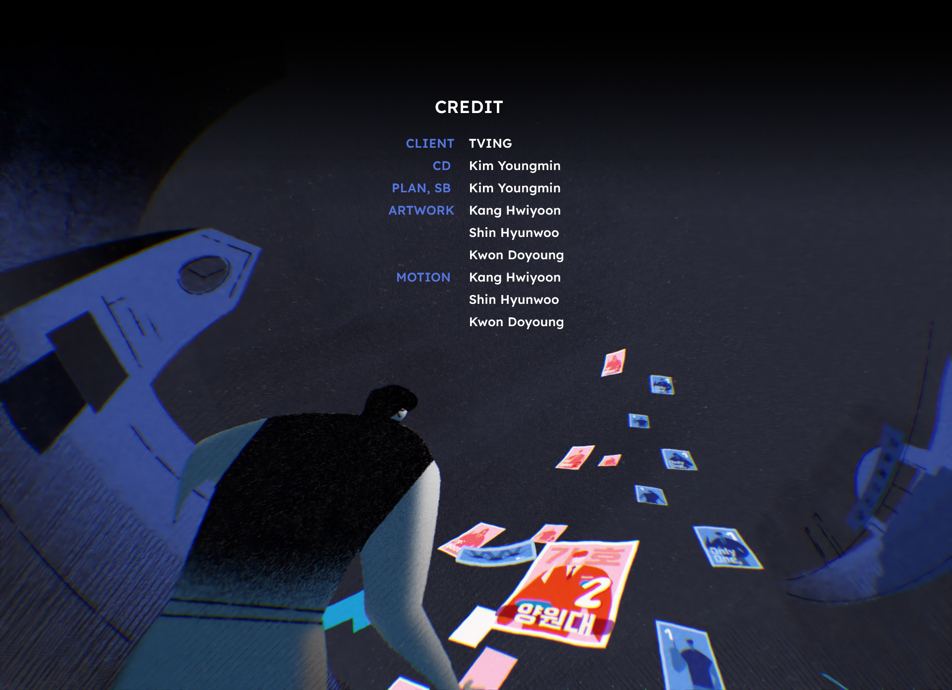 CLIENT TVING CD Kim Youngmin PLAN, SB Kim Youngmin ARTWORK Kang Hwiyoon, Shin Hyunwoo, Kwon Doyoung MOTION Kang Hwiyoon, Shin Hyunwoo, Kwon Doyoung